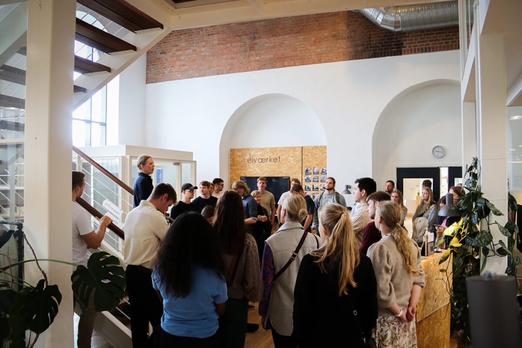 Allerede kl. 8.30 ankom bussen med studerende i Elværket Skive. Her stod den på morgenmad og en hurtig rundvisning. Viceborgmester i Skive, Mogens Birkelund, prioriterede at komme forbi og byde holdet velkommen til Skive. Han gav dem en kort peptalk om egnens grønne udvikling og de muligheder, der venter her efter uddannelsen. Herefter stod den på pitch i Elværket for Salling Autogenbrug og Vækstteamet Skive. Salling Autogenbrug har stillet en Green Challenge om upcycling af restmaterialer fra skrottede biler, og hvordan disse materialer kan anvendes i nye forretningsmodeller.
