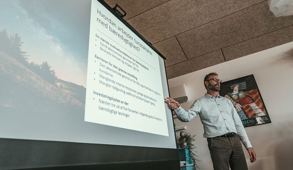 Til sidst var det Destination Limfjordens bæredygtighedskonsulent, Bo Immersen, som kom på banen med nøgledata om turisme samt stigende fokus på den grønne omstilling i området. Dog er det stadig uklart for mange virksomheder, hvad bæredygtighed egentlig er og hvordan fortolker man gæsternes efterspørgsel på bæredygtige oplevelsesprodukter i den post-pandemiske verden.