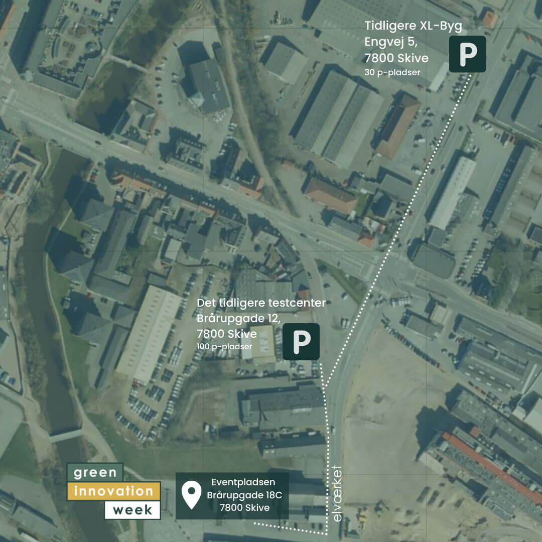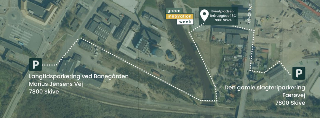 Green Innovation Week foregår i og omkring Elværket Skive, der er Skiveegnens innovations- og iværksættermiljø. Adressen er: Brårupgade 18C, 7800 Skive - Det er ikke muligt at parkere ved adressen.