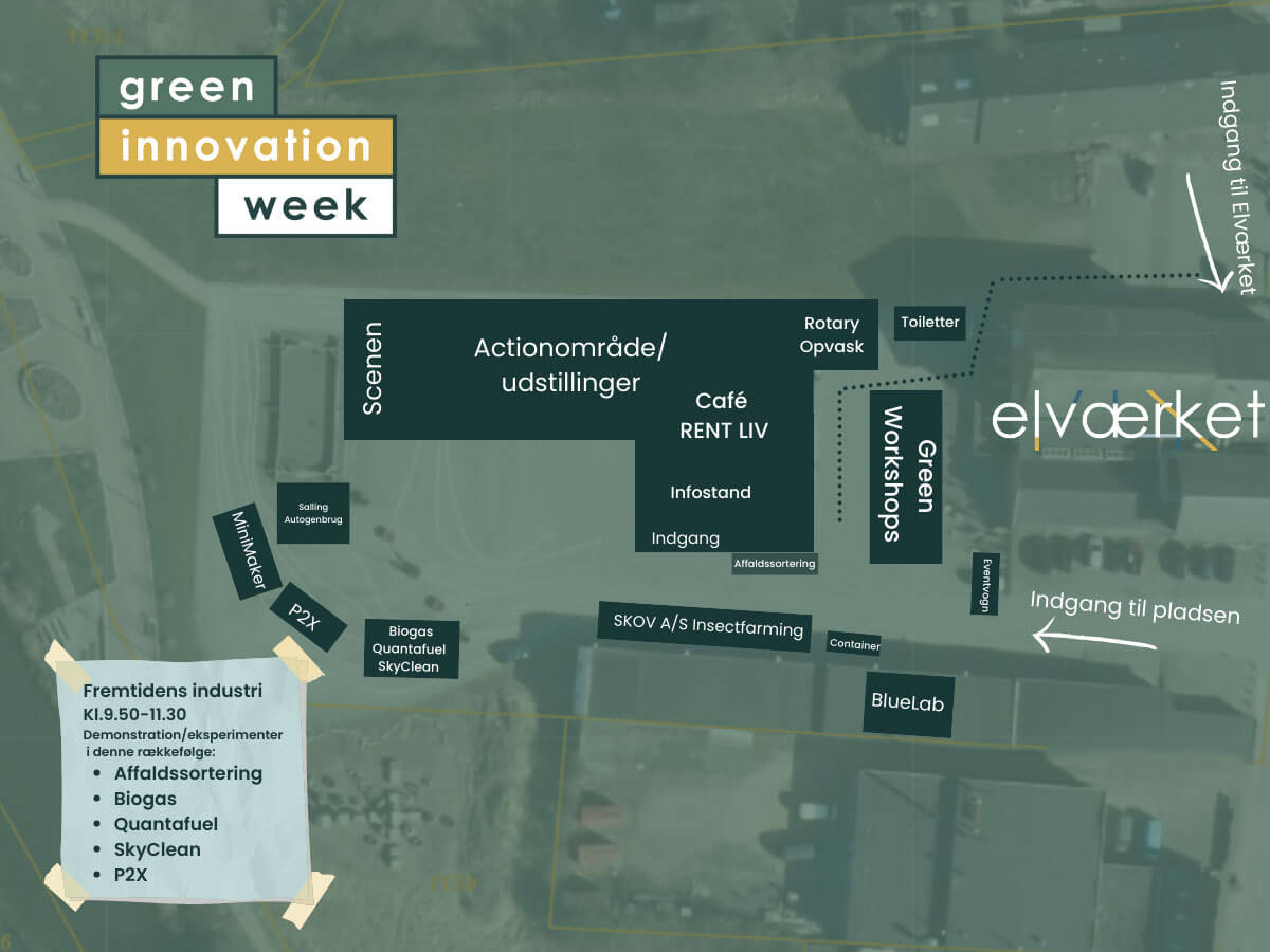Eventpladsen opbygges i samarbejde med Læringsambassaden Skive, der afholder Naturvidenskabsfestival på pladsen tirsdag, onsdag og torsdag i uge 39. Naturvidenskabsfestivalen er for skole- og dagtilbud, hvor Green Innovation Week henvender sig fra ungdoms- og videregående uddannelser til universitets- og forskningsniveau. Fredag d. 30. september indtager Green Innovation Week pladsen, hvor programmets aktiviteter er visualiseret i ovenstående oversigtkort.