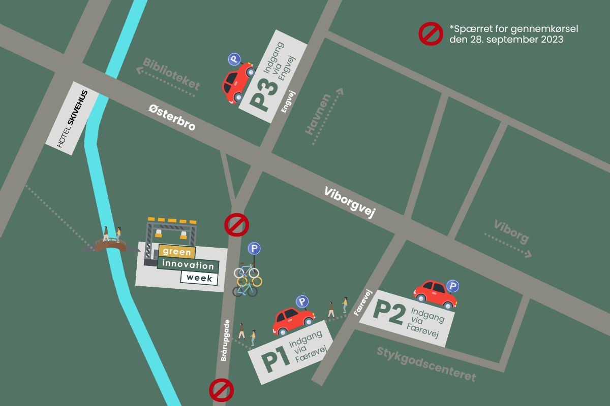 Parkering ved Stykgodscenteret. Tilkørsel via Færøvej 5, 7800 Skive