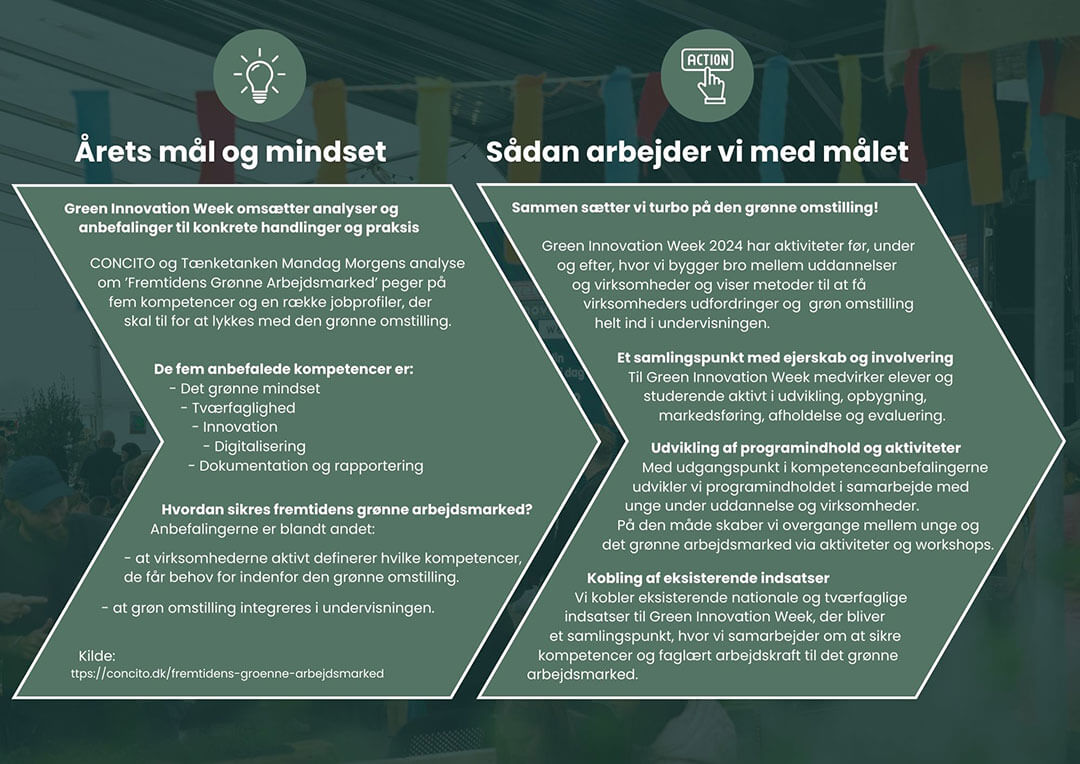 Når Green Innovation Week løber af stablen for fjerde gang i september 2024 bliver det med endnu højere involvering og endnu skarpere fokus på kompetencer til fremtidens arbejdsmarked. Læs mere om vores historie og tidligere udgaver